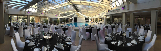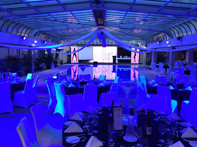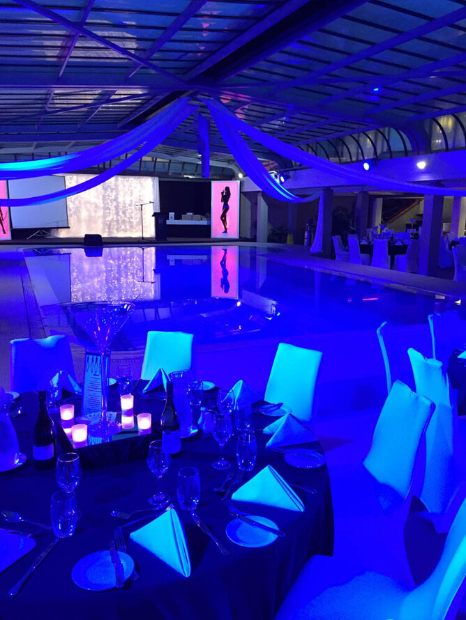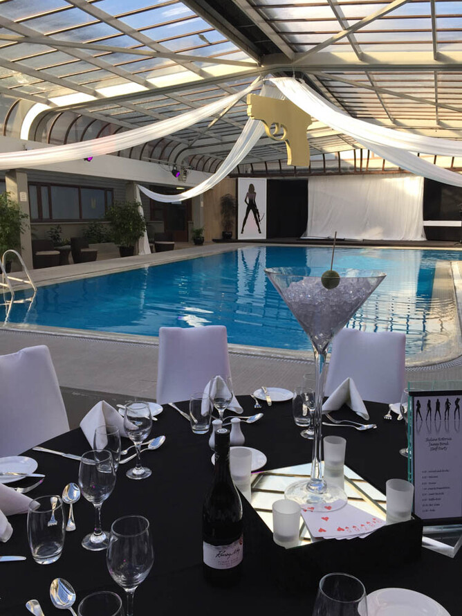 Skyline Rotorua staff enjoyed a night of martini’s and class for their James Bond themed dinner, held at the Millenium Hotel Rotorua. White draping above the pool glowed in our UV lights for a stunning effect.