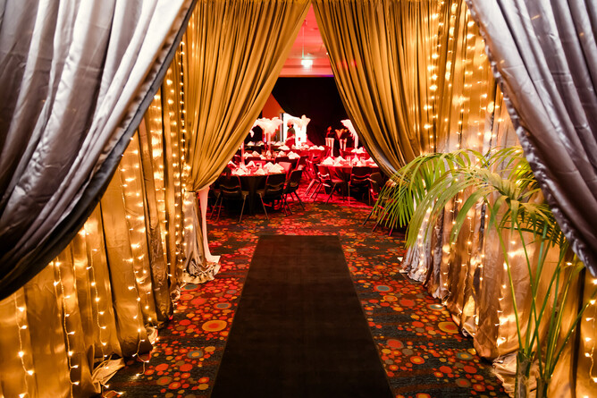 Even if you didn’t come dressed in fringe and pinstripes, the theming and styling alone made it feel like you were stepping into a scene from The Great Gatsby. From the moment guests arrived, they were greeted by a grand entrance dripping in drapes, fairy lights, and lush greenery, setting the tone for an evening full of vintage magic.