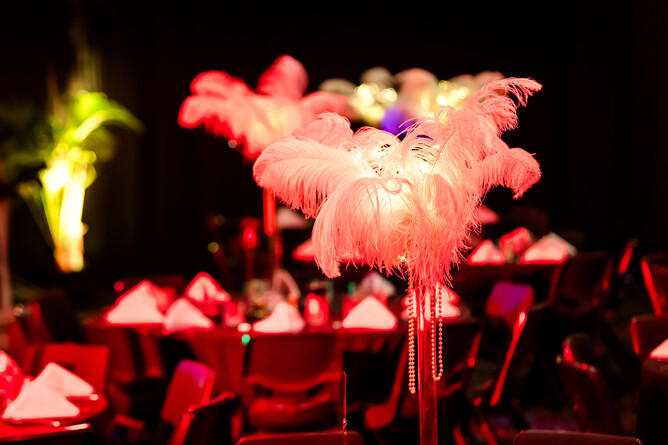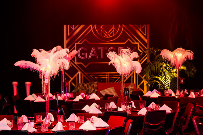 Inside the venue, every detail was carefully considered to bring the 1920s to life. Gold accents, feather centrepieces, and flickering lights sparkled across every table, creating a moody, romantic atmosphere with just the right amount of drama. The full styling package delivered a cohesive, bold visual experience that made this Gatsby ball one of the standout events of the school year.