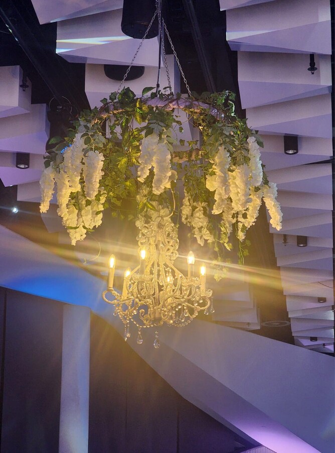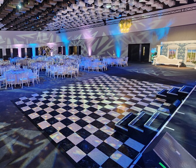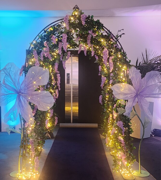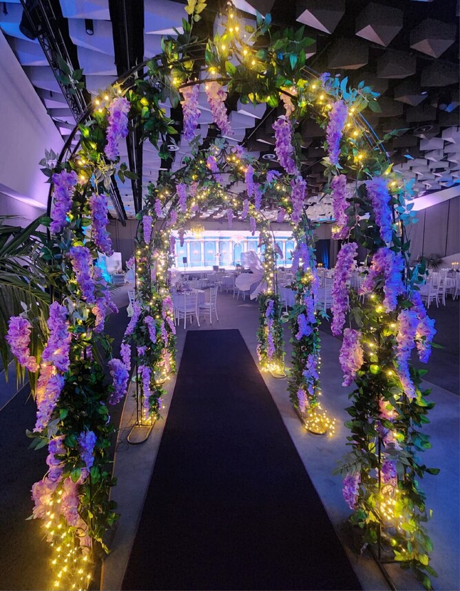 From the charming carriage at the entrance and the walk-through wisteria archways, to the glamorous photo backdrop with a cozy chaise lounge, everything was done with such elegance. The checkered black and white dance floor, the lovely mauve table runners, candelabras and the colorful flower bouquets on each table made the whole space come alive.