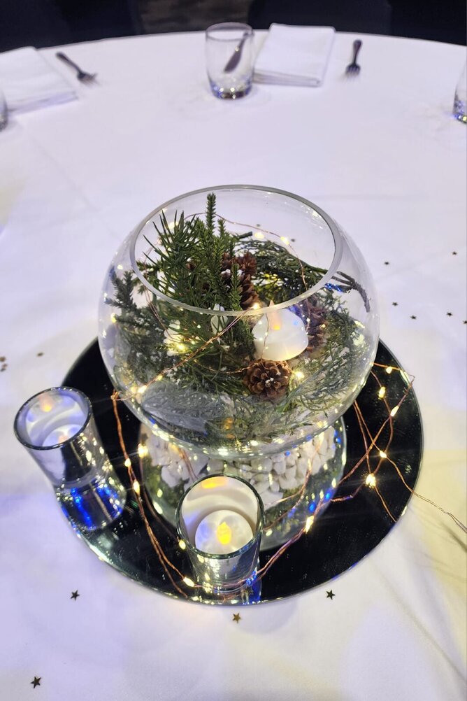 The centerpieces were beautifully crafted by the student ball committee, featuring snowy tree branches and Wild Apricots charming fishbowl vases filled with stones, pine cones and branches, and a dusting of snow — everything looked so enchanting!