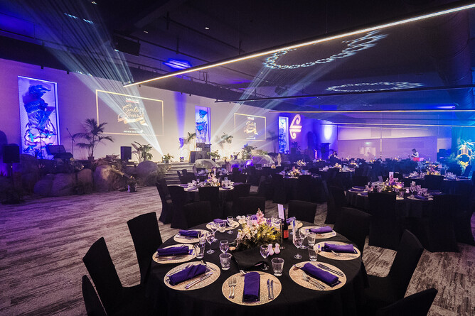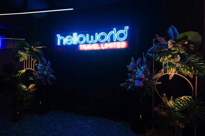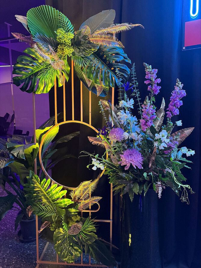 The event theming was designed to impress, featuring an entrance lined with towering peace lilies, lush ferns, and tropical palms, all enhanced by gorgeous mood lighting. Highlights included a custom Air New Zealand light-up bar, a Helloworld photo wall framed in gold and adorned with fresh florals, and matching gold frames for the awards backdrops, creating a cohesive, elegant visual story.