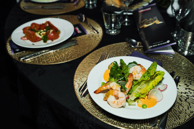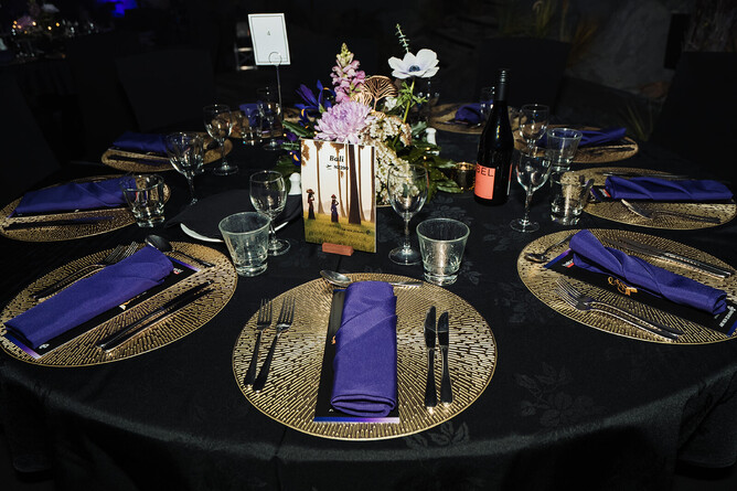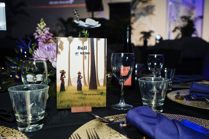 Guests dined at beautifully styled tables, set with gold placemats and rich purple napkins to complement Air New Zealand’s brand palette. Each table featured custom travel-themed destinations, bespoke menu designs, and vibrant fresh floral arrangements to complete the luxurious setting.